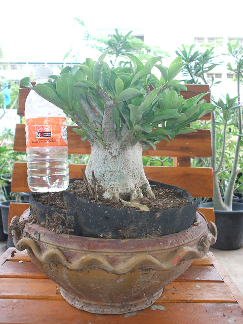 ต่อไปเป็นภาพปัจจุบันหลังจากถอนออกจากกระถางก้นตื้นครับ เทียบขนาดกับขวดน้ำสิงห์